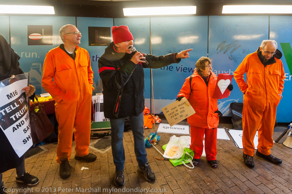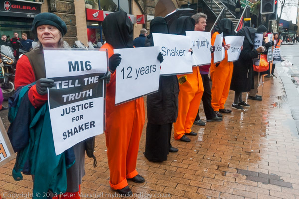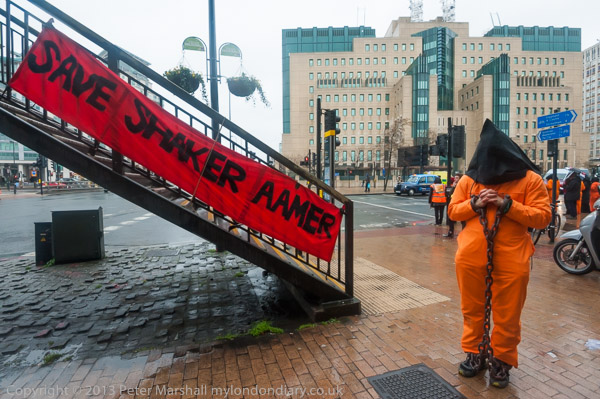 'Save Shaker Aamer' banner and protester in orange jumpsuit, black hood and chains