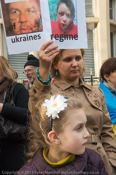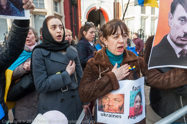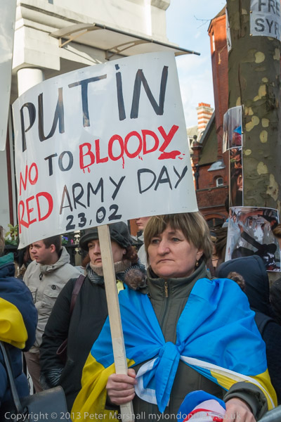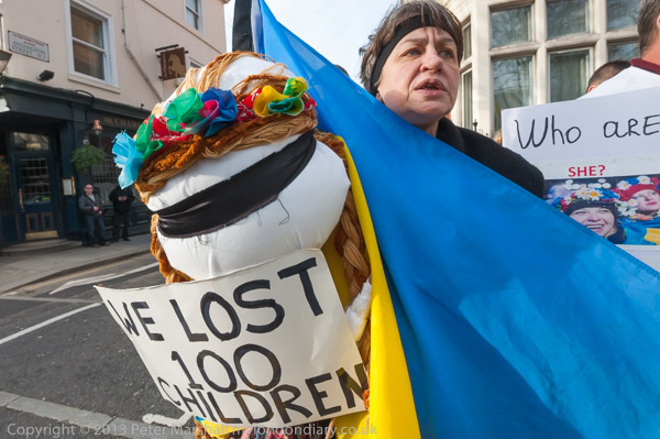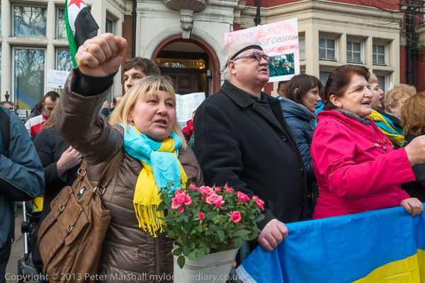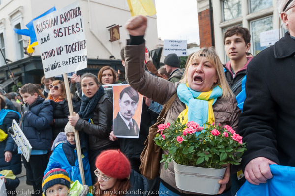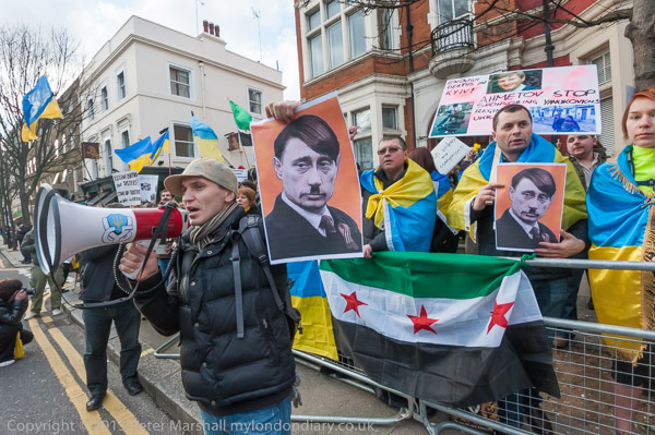The Ukrainians protested with a Syrian flag next to the Ukrainian - both countries have suffered because of Putin's interference
