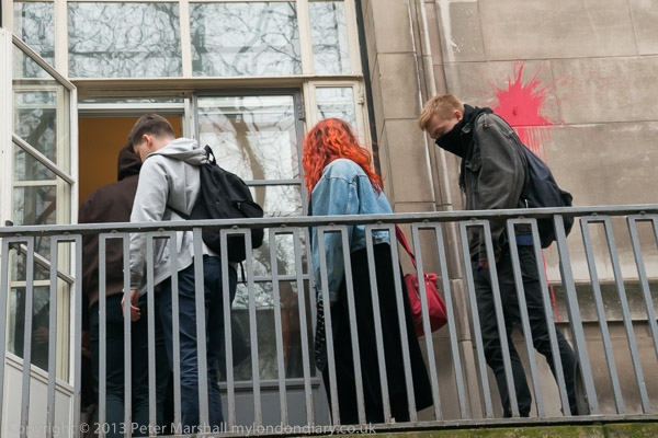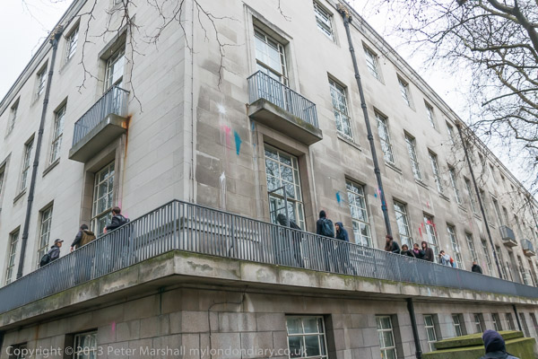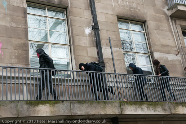 Some decided to climb out of the windo onto a balcony. They looked through some windows