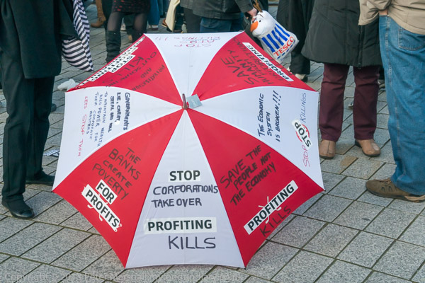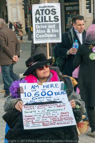 A disabled protester with friends and a placard 'Cameron Undo Nasty Taxes'