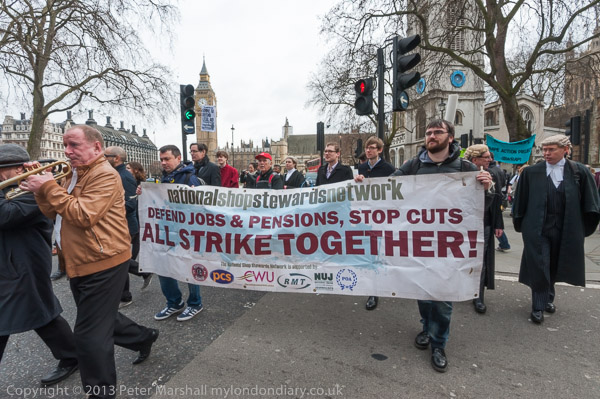 ![]() The march went around Parliament Square ![]() ![]() ![]() The National Shop Stewards Network banner on the march ![]() The march stopped at the Lib-Dem HQ on Great George St ![]() Where Paddy Hill and others took in letters to Nick Clegg ![]() ![]() ![]() The band on the march ![]() |