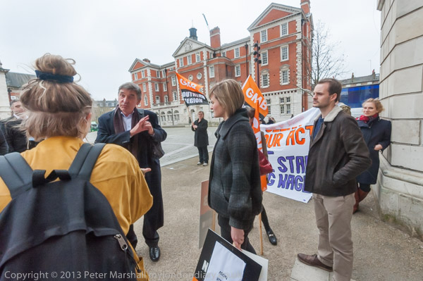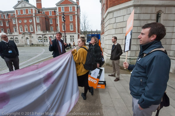 They were told they could go in to the meeting so long as they put down their banners, placards and megaphones,