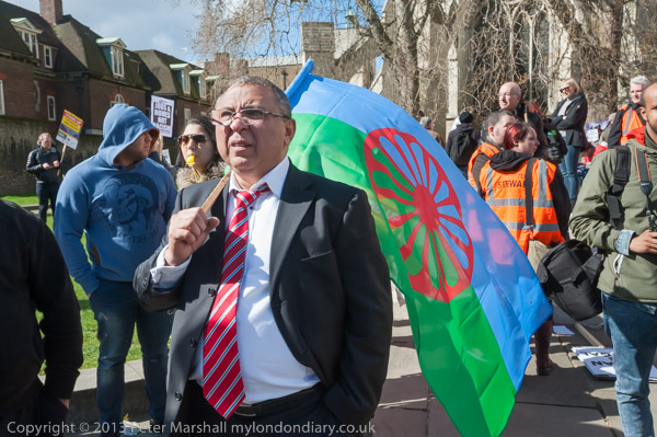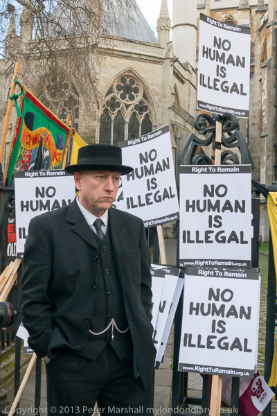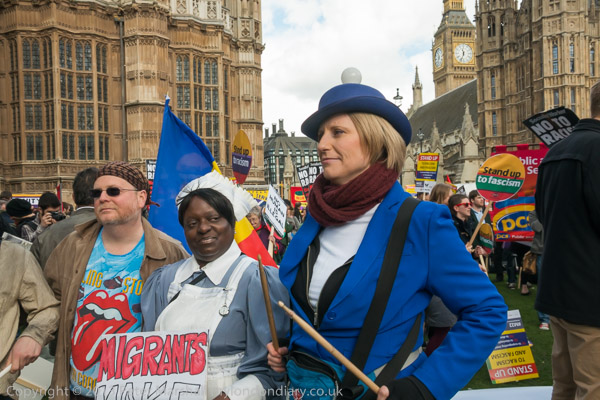 A man in a three-piece suit and hat - and another in a union flag costume with placards