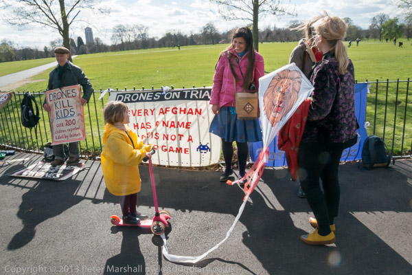 peace activist Maya Evans ties up the Drones on Trial banner 'Every Afghan has a nam, War is not a video game'