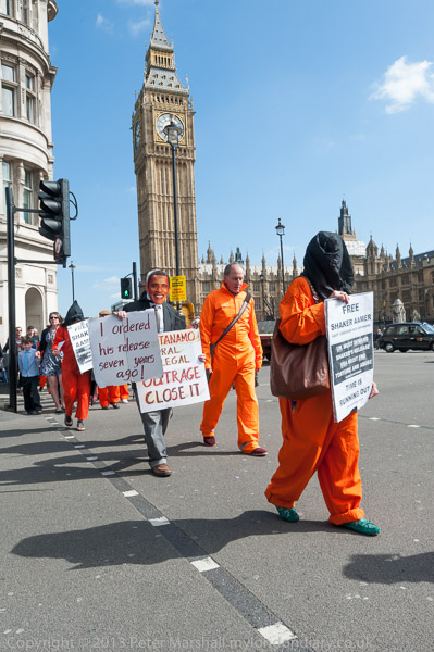 Protesters including one as President Obama get lined up to march to the Foreign Office