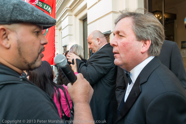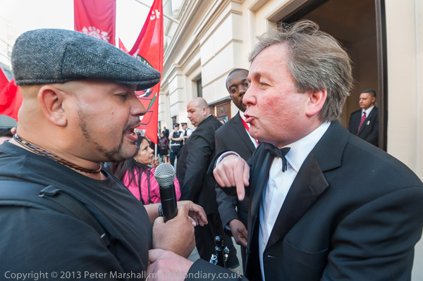 An opera-goer argues with cleaner's leader Alberto Durango. He seemed to feel they had no right to protest
