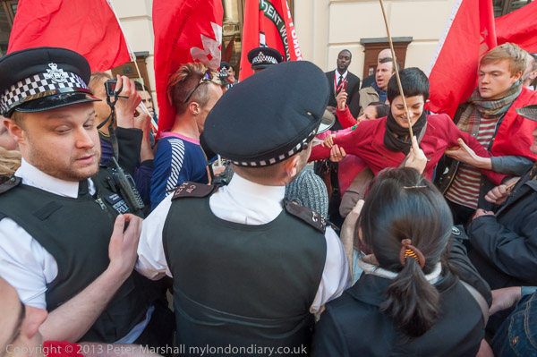 Police arrived in force and tried to grab one of the protesters