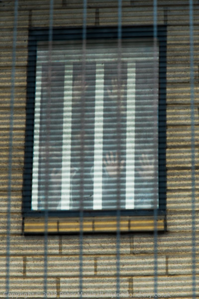 We could vaguely see a lot of hands and very dim faces in the windows. As well as the grid of the fence there is a layer of dirty glass and another of plexiglass between them and us.