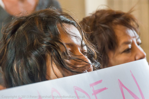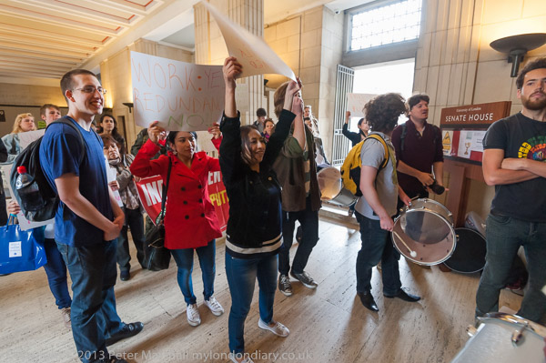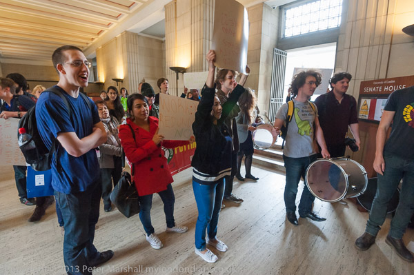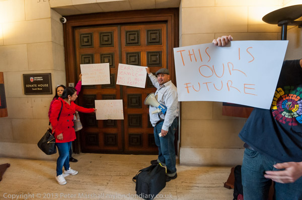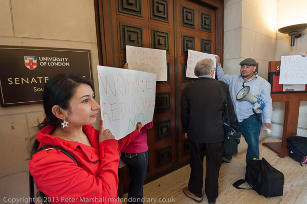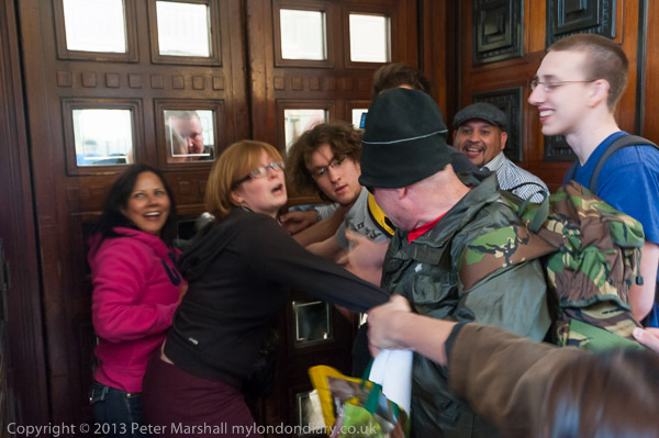 but the security staff manage to pull the door closed. The protest remains good-natured and the attempt to