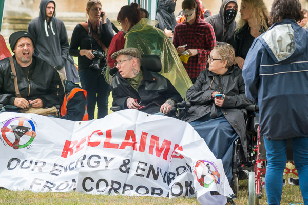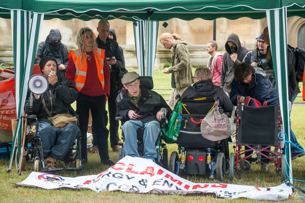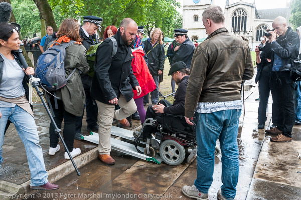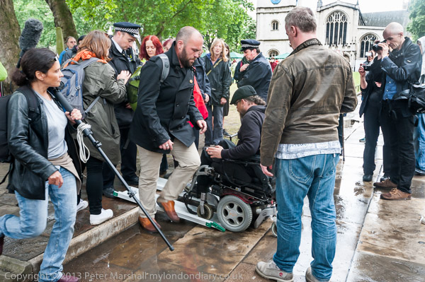 Police try to take away the wheelchair ramp - but a protester stands on it