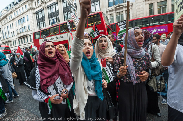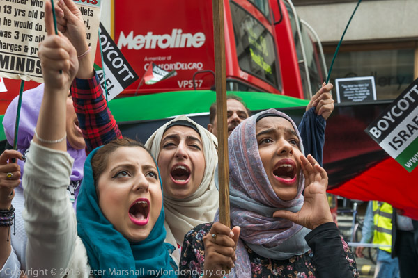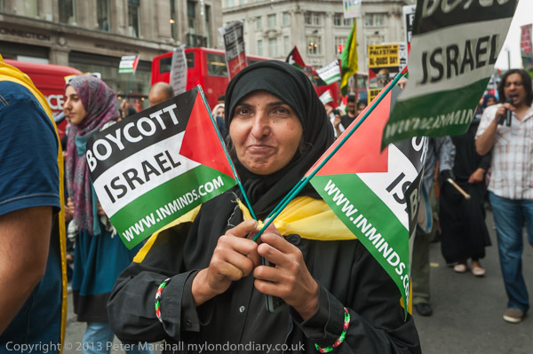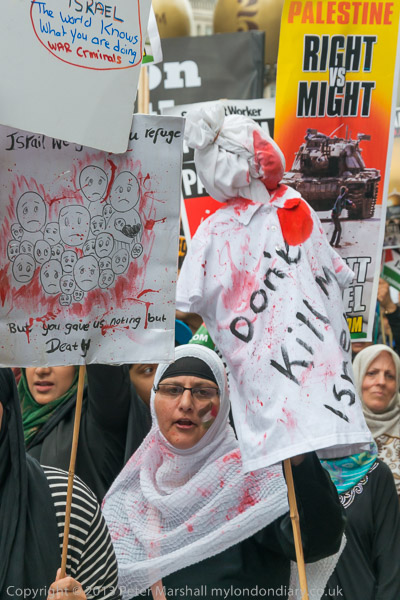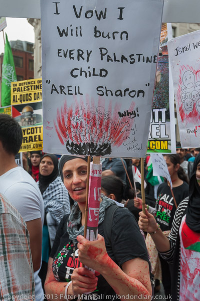 One woman had a placard with an an alleged quotation from Ariel Sharon about burning Palestinian children