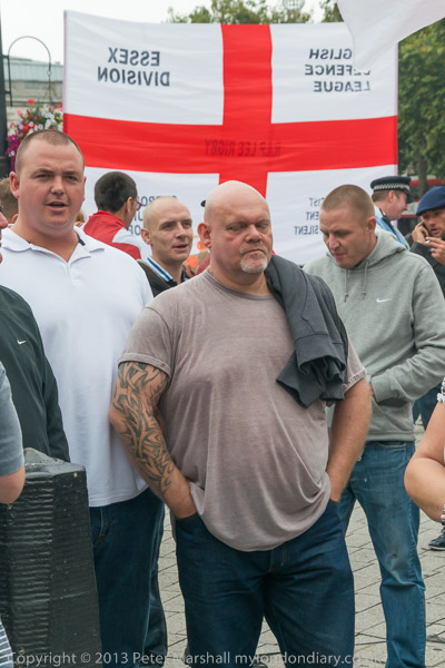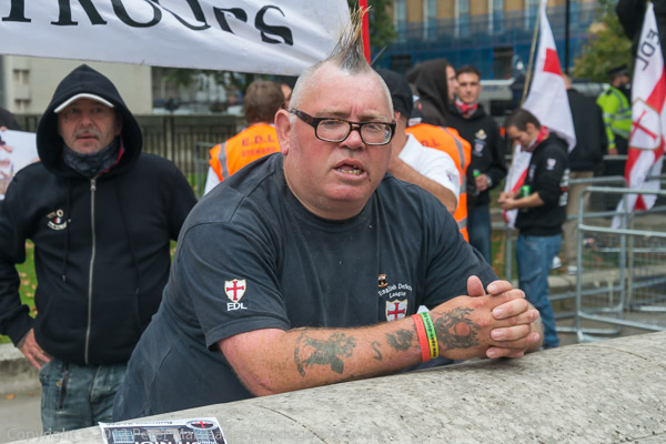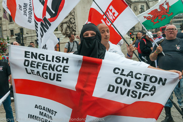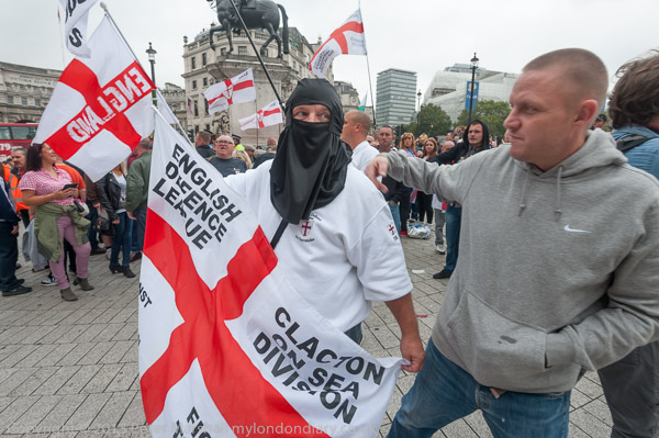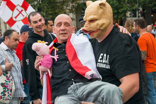 One man in an E.D.L. Rotherham Lads shirt is wearing a pigs head - and lifts up another protester who is carrying a pink pig