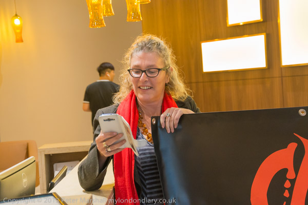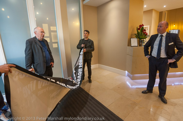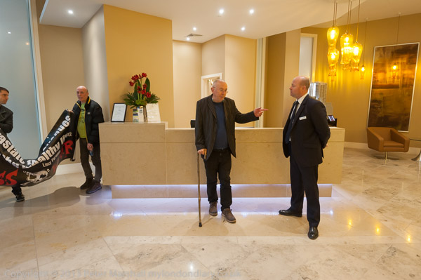 Ian Bone talks with the building manager in front of the reception desk