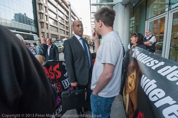 A man comes and starts an argument with the protesters, complaining they had refused to answer his question