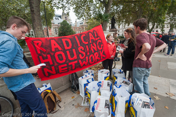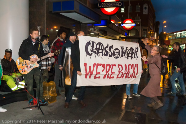 Class War's 14th weekly protest at the 'rich door' of Redrow's One Commercial St flats was a lively affair, with the banners dancing to the music of Rhythms of Resistance, a poetic performance and some rousing speeches against social apartheid.