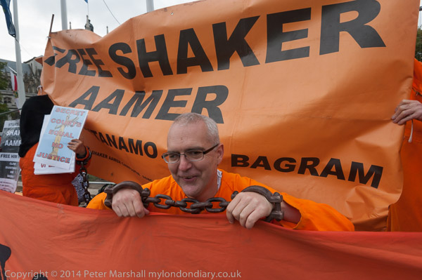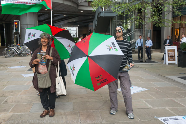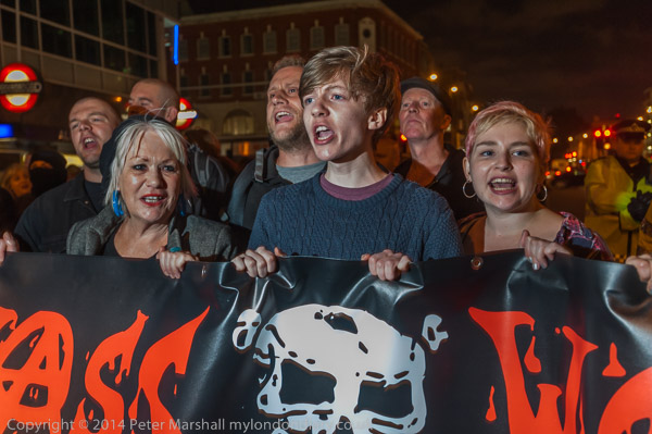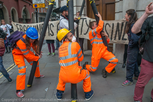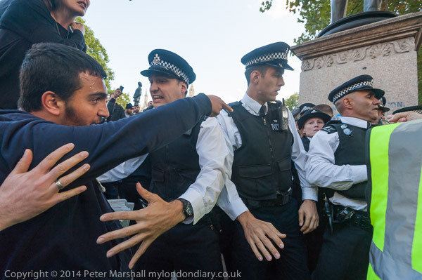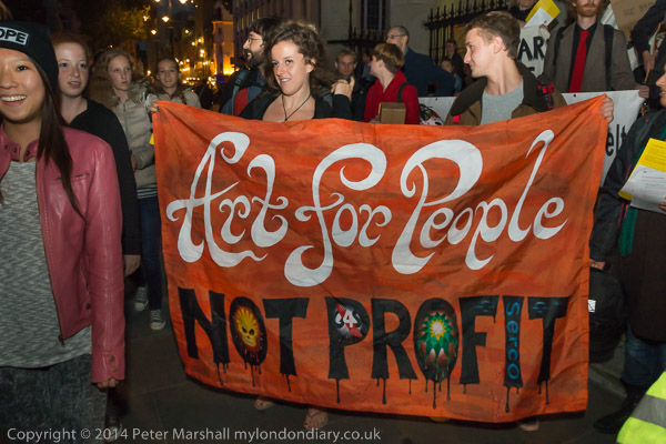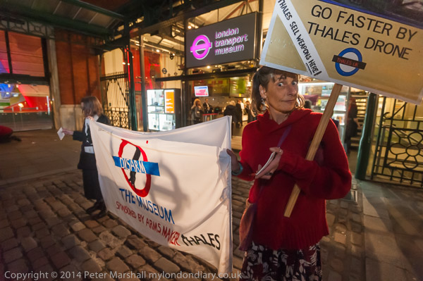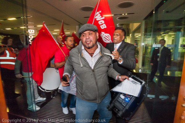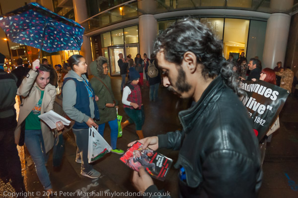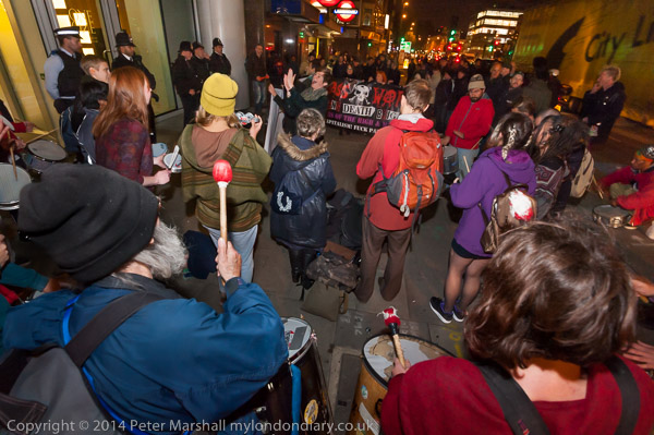 Security men asked them to leave, and after a short protest inside they did so, continuing to protest on the pavement outside. There were a few minor incidents, with one security man attacking a photographer and a little unnecessary pushing and shoving by them, including a small moment of farce when one man tried to prevent the protesters from leaving.