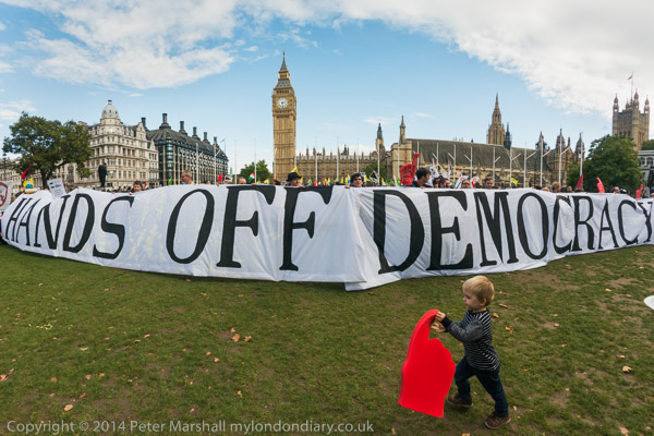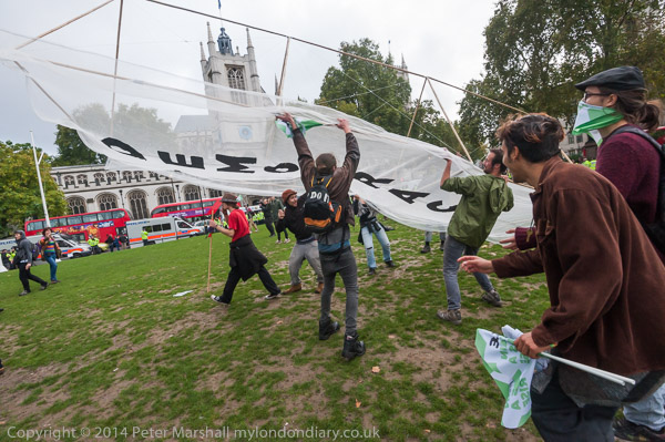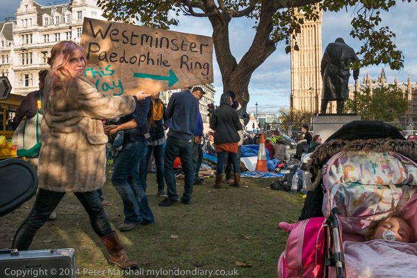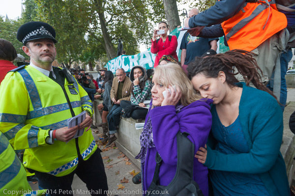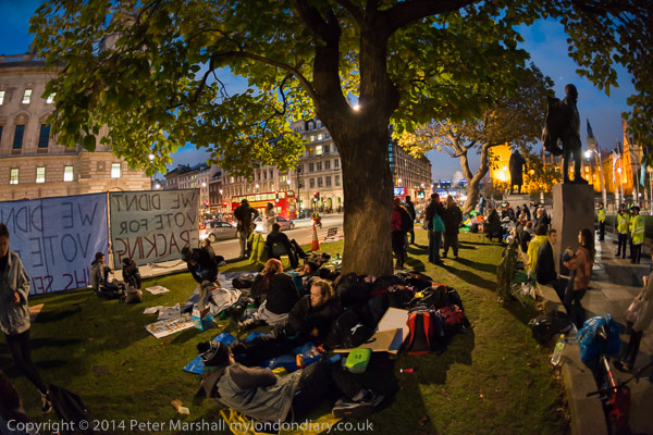 A week after the initial rally in Parliament Square, Democracy Camp, now also called #tarpaulinrevolution, was still continuing at one side of Parliament Square despite fencing and continued harassment by police, egged on by the GLA's private security force, the so-called Heritage Wardens.