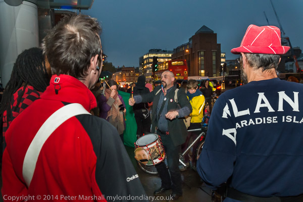 Rather to my surprise, Danny was still up on the plinth with Churchill, and there were cheers when he completed 24 hours there. Apparently another protester had been arrested earlier for throwing him a bottle of water, and while I was there, performance poet and activist Martin Powell arrived with a plastic tub of food for him.