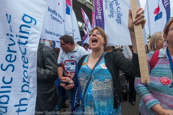 After gathering on the edge of Trafalgar Square, the procession formed up for itws slow march down Whitehall. There seemed to be rather fewer banners than in previous years, and fewer people. It stopped at Downing St, and then moved to the side of the road opposite for the rally.