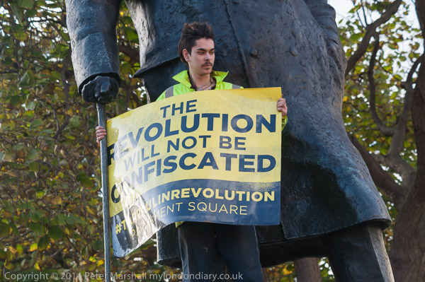 Although police and 'heritage wardens' have fenced off the main grass area, Occupy Democracy continued to protest on the square, with workshops, Danny on the Churchill statue over 24 hrs and activist poet Martin Powell arrested for throwing him food.