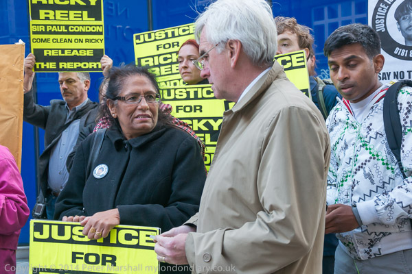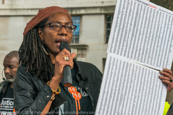 Other speakers included Marcia Rigg, whose brother Sean Rigg was killed by Brixton police in 2008, Doreen Bishop, whose son Ricky Bishop was also killed in Brixton Police Station in 2001, Ajibola Lewis, the mother of Olaseni Lewis who died when restrained by police called to a Croydon hospital, Jo Orchard, whose brother Thomas Orchard was killed by police illegally restraining him in Exeter, Stephanie Lightfoot-Bennet, whose twin brother Leon Paterson was killed by police in Manchester in 1992, and Carole Duggan whose nephew Mark Duggan was shot by police in Tottenham in 2011.
