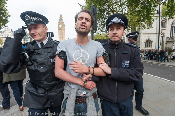 Police immediately grabbed him, put on handcuffs and led him away. As they took him along two sides of Parliament Square towards a police van he loudly declaimed his poem 'The Missing Peace'.
