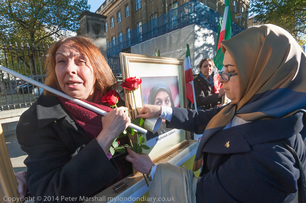 The protest opposite Downing St organised by the National Council of Resistance of Iran (NCRI) called for the UK to condemn the attacks by regime-organised acid attacks on women who are not veiled in Iran, followed similar protests in Isfahan and Tehran and condemned Iran's hanging at dawn of Rayhaneh Jabbari.
