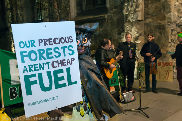 Protesters from Biofuelwatch and London Biomassive, some dressed as wise owls, picketed the second birthday celebrations of the Green Investment Bank at Bank of America Merrill Lynch in London against their funding of environmentally disastrous biomass and incineration projects.