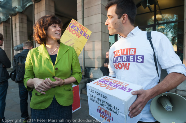 The Campaign for Better Transport, including their director Stephen Joseph OBE protested at the Dept of Transport before walking to Portcullis Hous to hand a petition with over 4000 signatures to Rail Minister Claire Perry MP calling on the recent increase in Northern Rail evening peak rail fares to be scrapped.