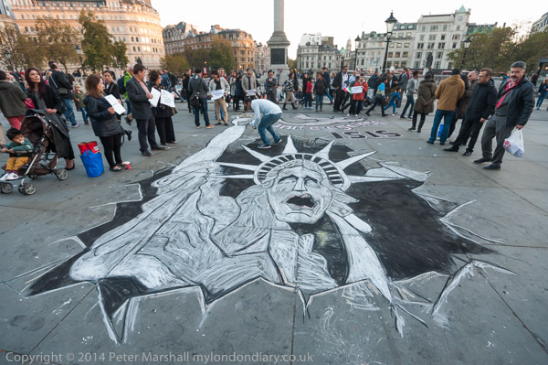 around a giant pavement chalk drawing based on an agonised Statue of Liberty