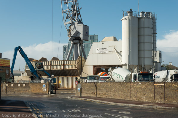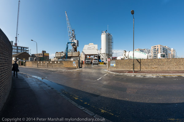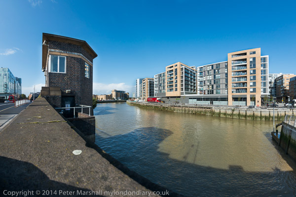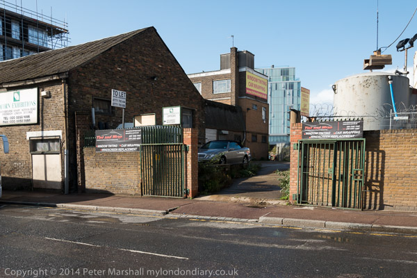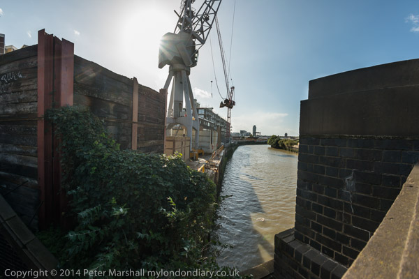Looking south from the east end of Deptford Creek Bridge, straight into the midday sun