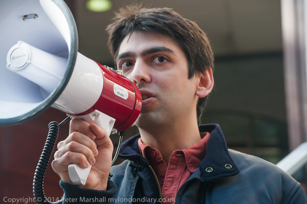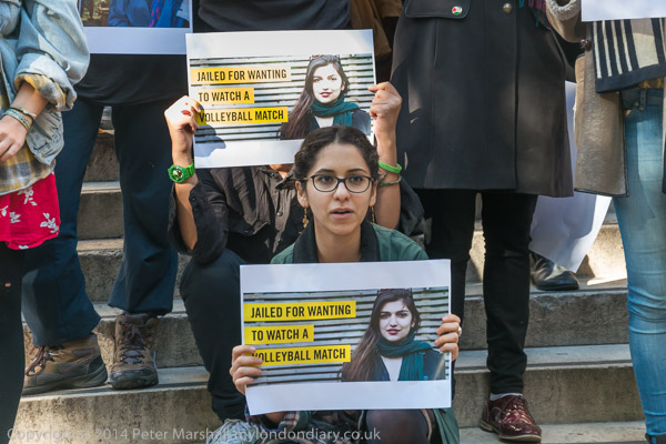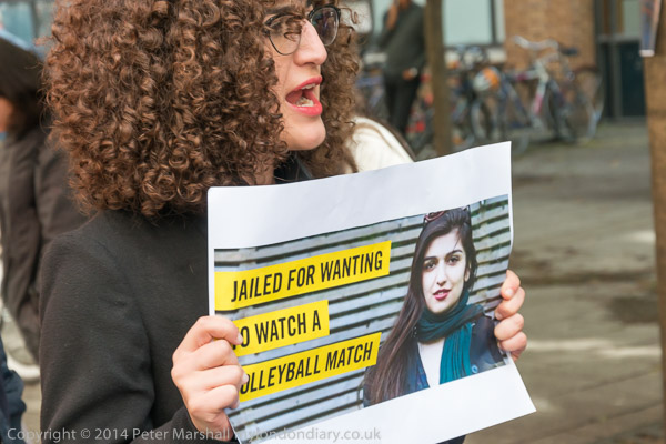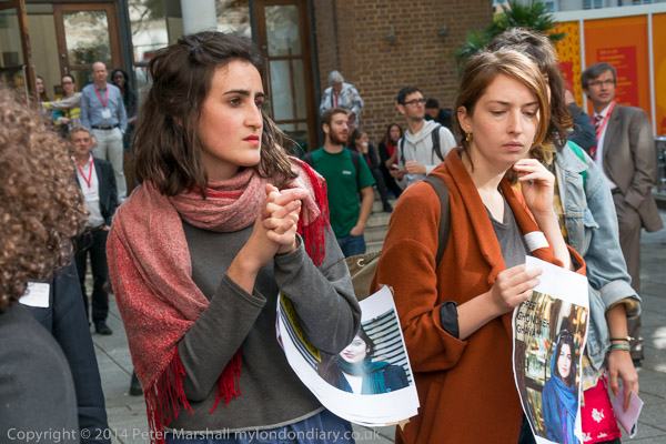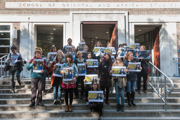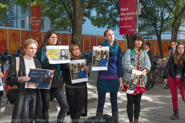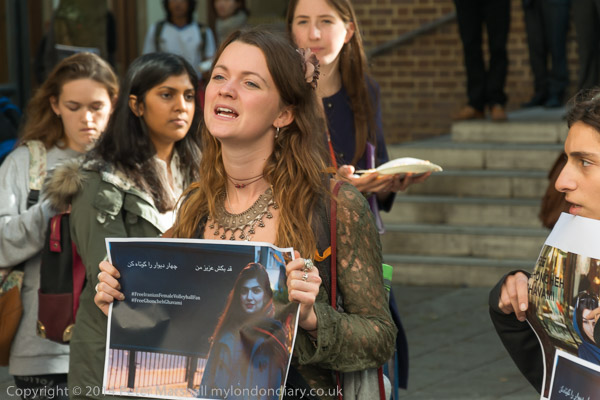 ![]() ![]() ![]() SOAS UCU Campaigns rep Richard Alexander ![]() ![]() People pose with the posters about Ghoncheh Ghavami - but some hide their faces behind them ![]() as they fear the consequences in Iran if their faces were seen protesting ![]() ![]() ![]() ![]() One of the protest organisers speaking with a label that she is hunger striking today in solidarity |