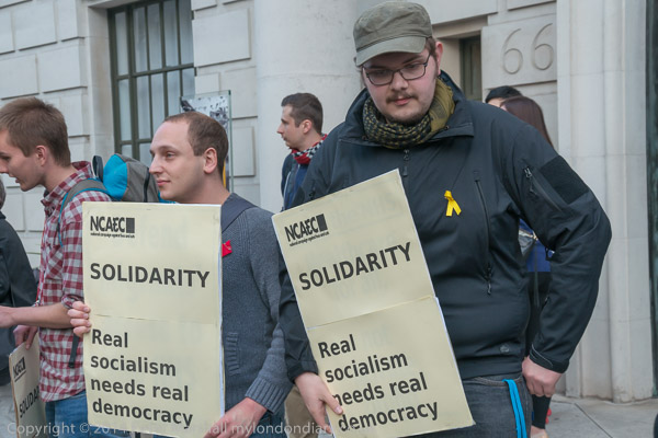 A Chinese activist talks with Daniel Cooper of the National Campaigh Against Fees and Cuts