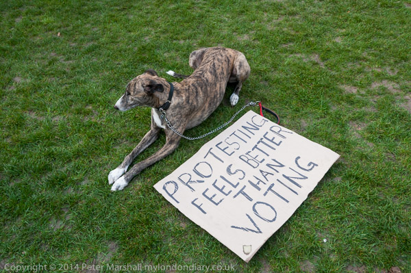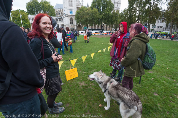 Some of the protesters remain on the pavement - the grass is a little muddy for wheelchairs, though some go on it