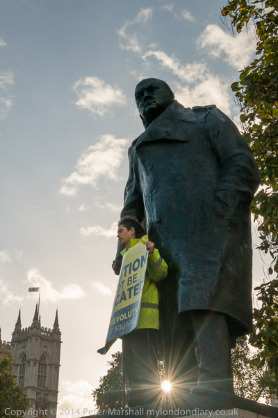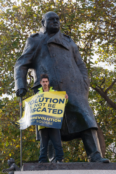One protester had gone up to join Chuchill on his plinth shortly before I arrived, with a banner which read: