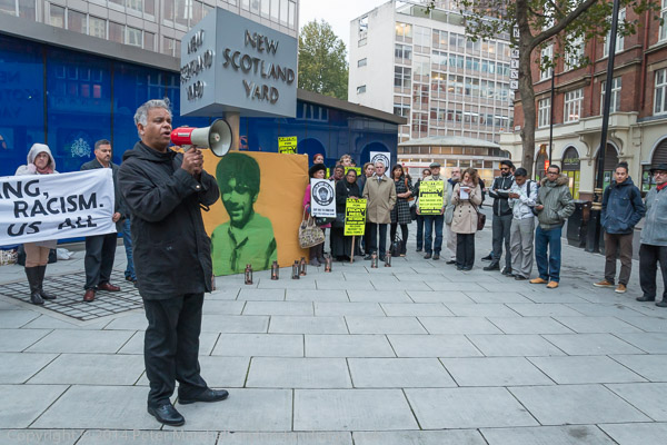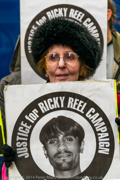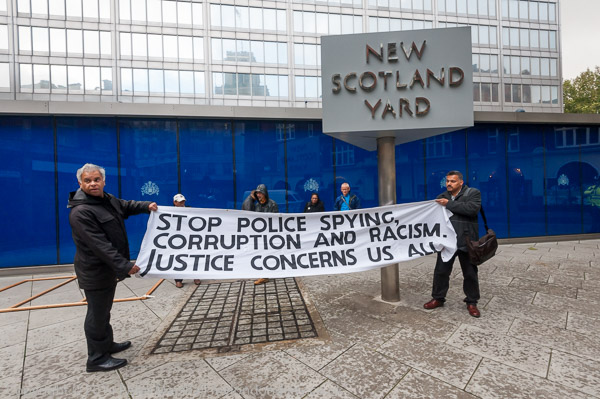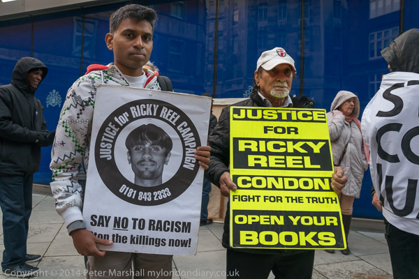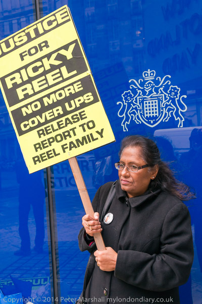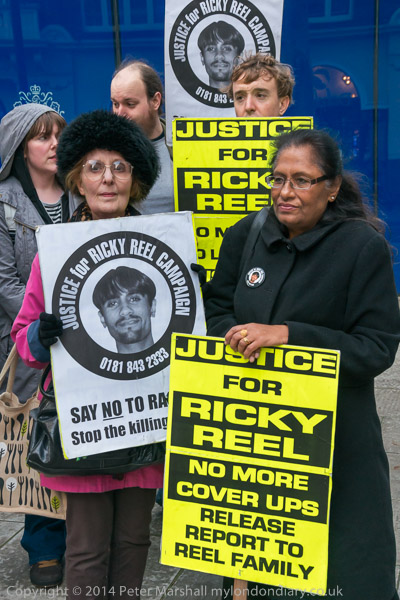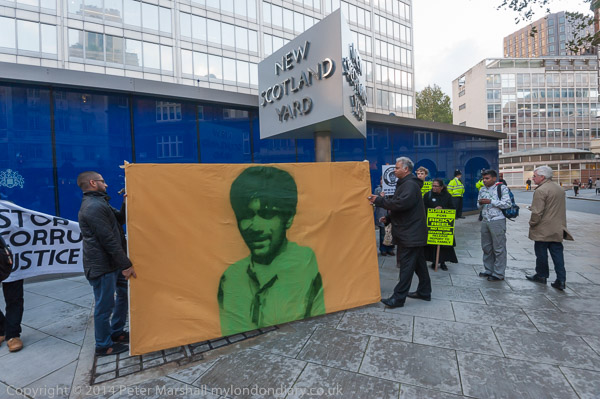 Campaigners hold a large portrait of Ricky Reel in front of the New Scotland Yard sign