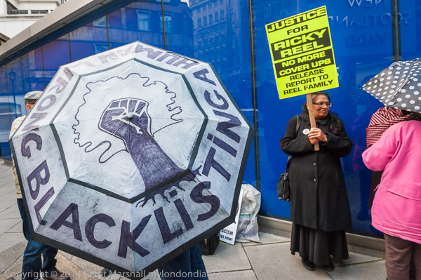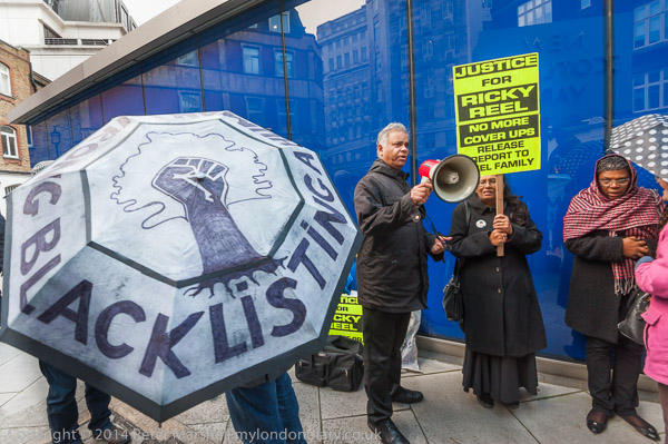 'Wrong Blacklisting a Human' umbrella and Sukhdev Reel with a placard calling for Justice for Ricky Reel.