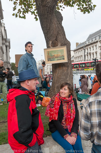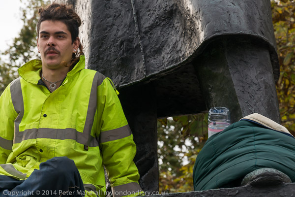A protester sits on the plinth of Churchill's statue. He had been there around 23 hours when I took this picture