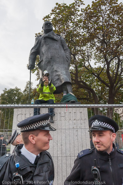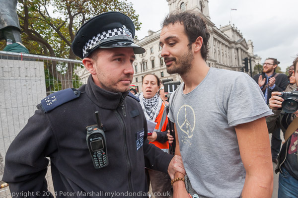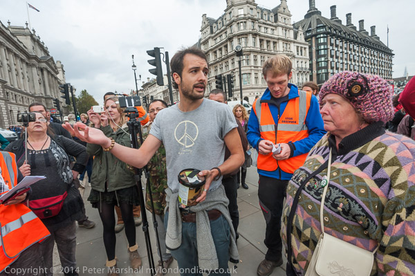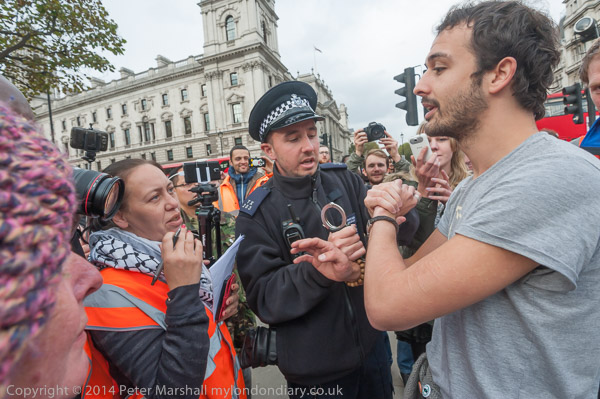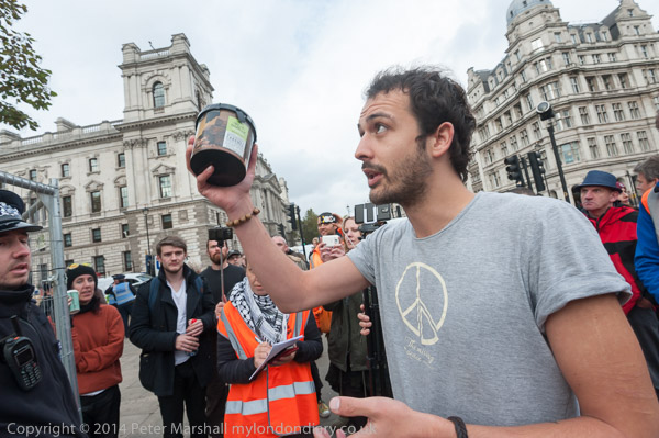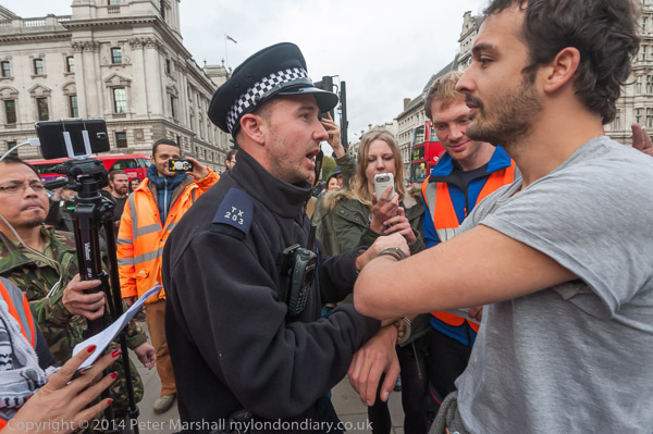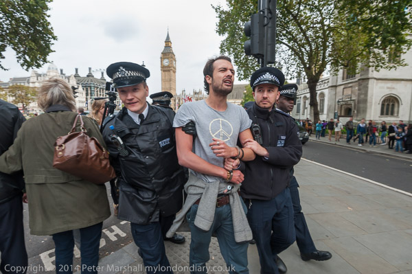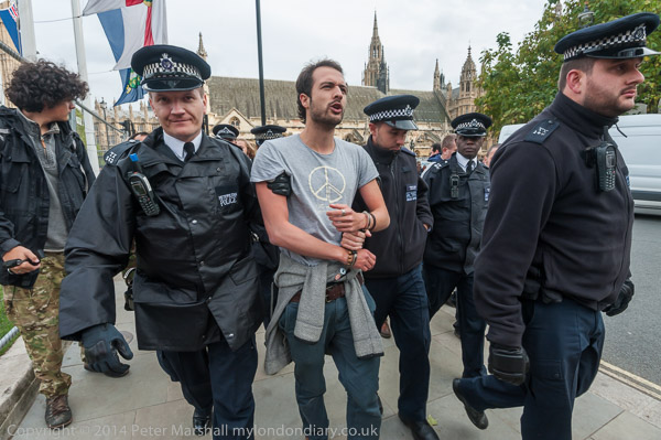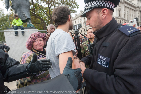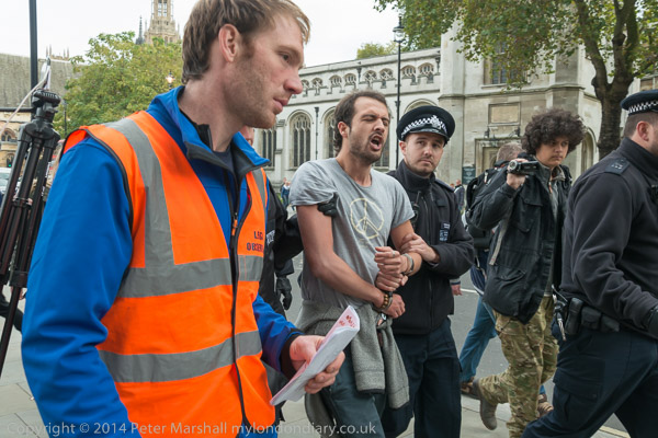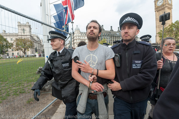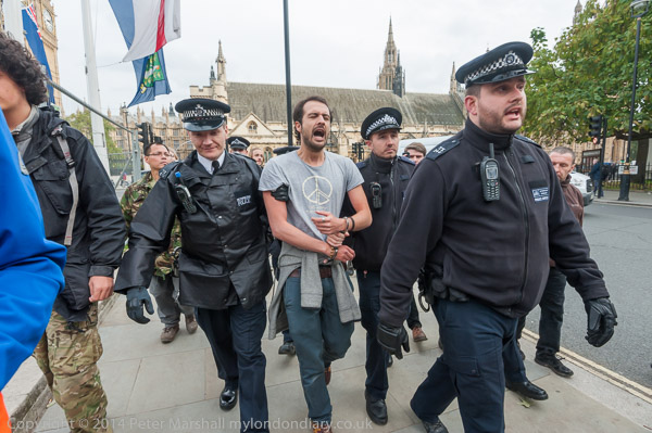 Martin Powell is still performing his poem 'The Missing Peace' as they lead him towards a police van.