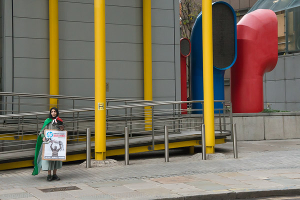 Some of the architectural features of the HP building, with a Palestinian handing out leaflets