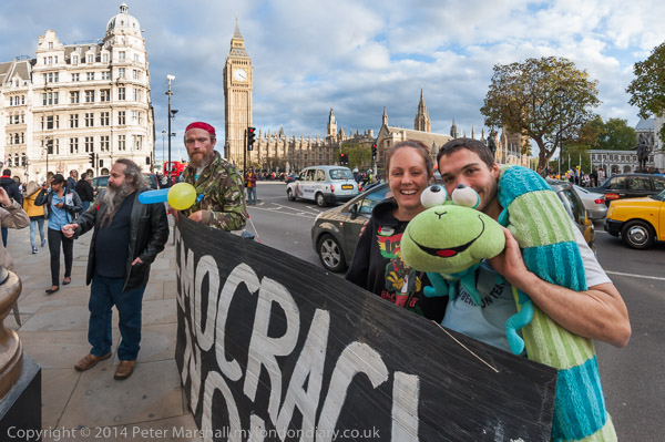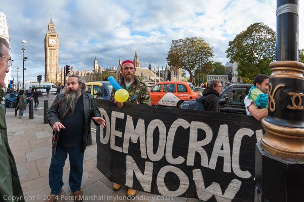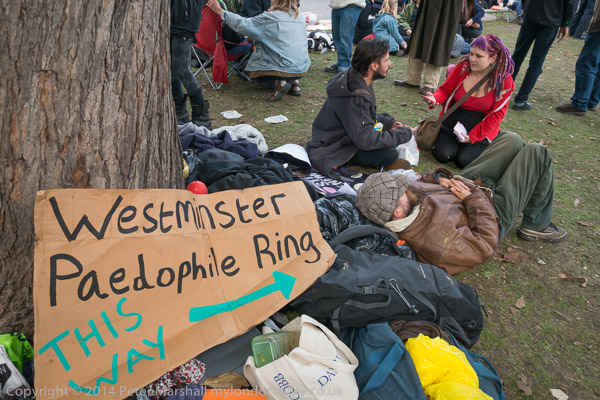 A woman holds up the sign 'Westminster Paedophile Ring - This Way' pointing at the Houses of Parliament