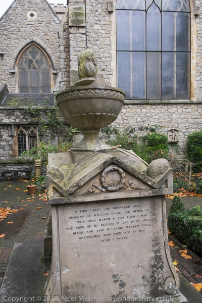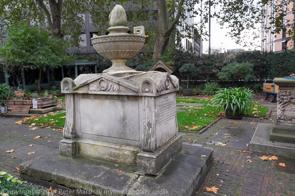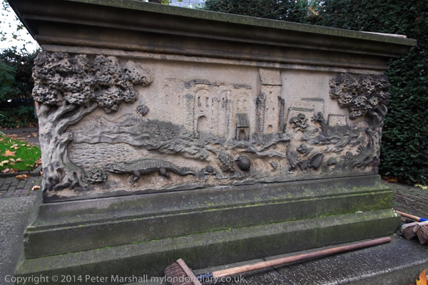 The memorial is in Coade Stone (made in Lambeth) and on its top is a breadfruit - which the Bounty