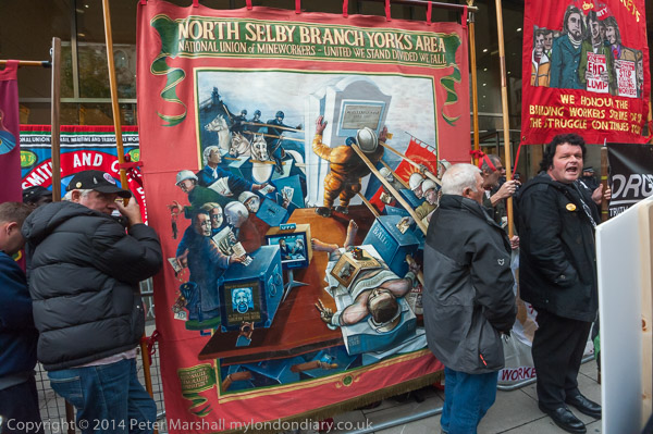 A NUM member holds the North Selby Miners banner at Orgreave Truth and Justice Campaign protest outside the