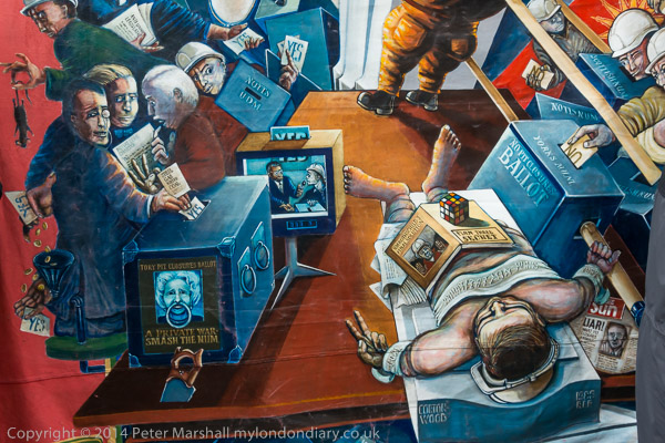 North Selby branch banner with graphic images of the battle of Orgreave and its media cover-up and lies.