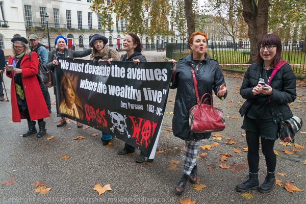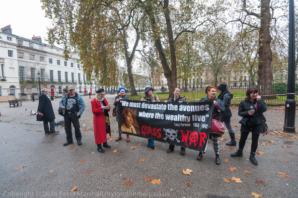 Class War pose with the Lucy Parsons banner outside the £7m Fitzroy Square home of Griff Rhys Jones