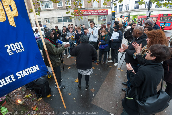 People stand in silence remembering Ricky Bishop and others killed by police at Brixton Police Station