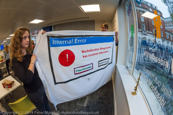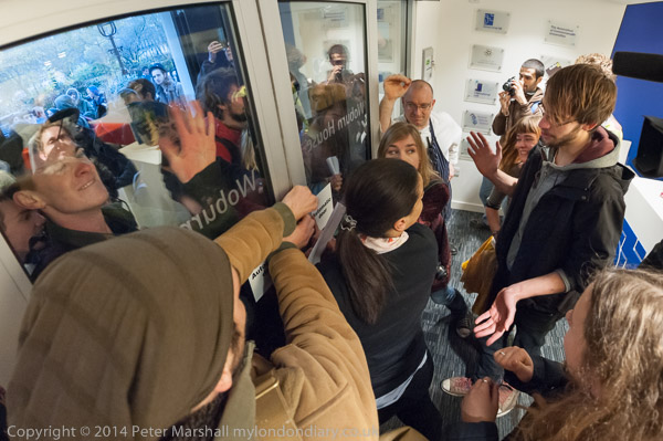 Universities UK staff hold it closed, but students inside and out try to pull it open