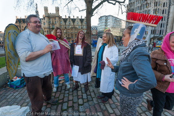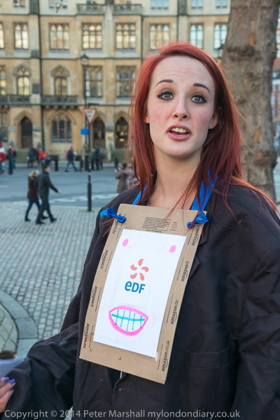 Westly Ingram who wrote and organised the event hands out props with Westminster Abbey in the background. EDF was one of the villains in the play