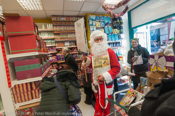 Santa walks into Morley Stores with a placard 'Lambeth Needs a Pay Rise'