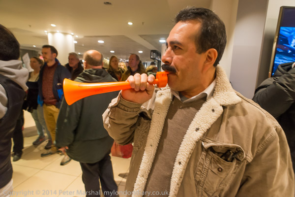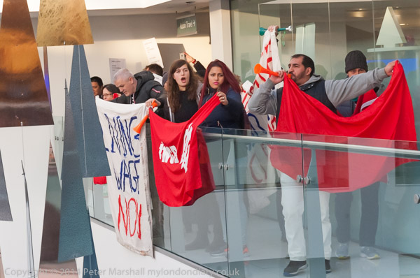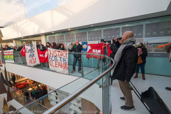 ![]() a balcony leads around to the down escalator ![]() and the protesters pause here to display banners ![]() as by now there are people watching from the lower floors to see what is happening ![]() Alberto Durange, IWGB leader makes a brief speech ![]() ![]() and then people pick up the banners and move towards the escalator down ![]() but are briefly stopped by a security employee ![]() so they put their banners over the balcony again ![]() ![]() |
